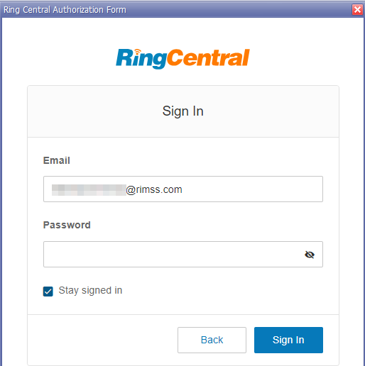 Once the user is configured, they will need to log into their Ring Central phone app and keep it open on their PC. Next, open RIMSS and navigate to the Ring Central Form tab. You will only be able to activate Ring Central in the first session of RIMSS that you open. After clicking the checkbox for "Monitoring Activated", you will see a Ring Central pop-up requesting you to log in to authorize the interface. This authorization is required each time you log in to a new session of RIMSS and turn on monitoring. Any secondary sessions of RIMSS that you open will not populate the Ring Central tab.