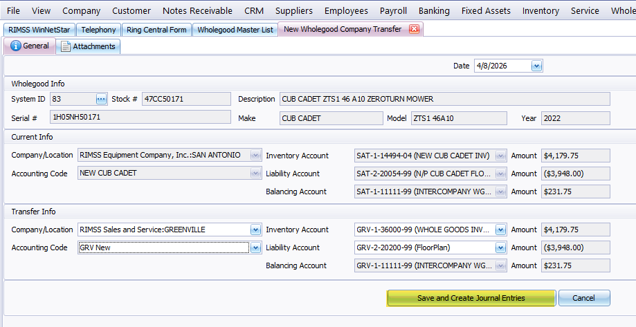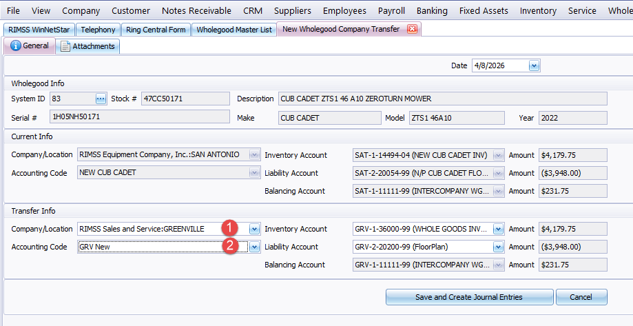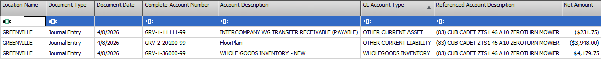 The system creates journal entries in each company and moves the owning Company/Location of the wholegood. The resulting entries from the above entry are shown below.