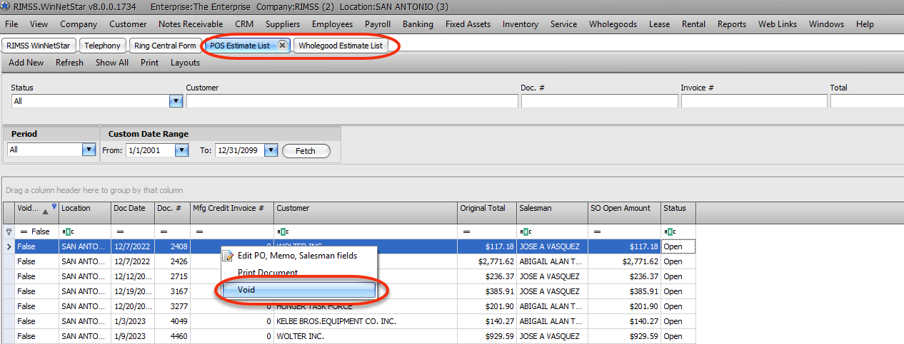 Voiding Estimates from the Estimates List View