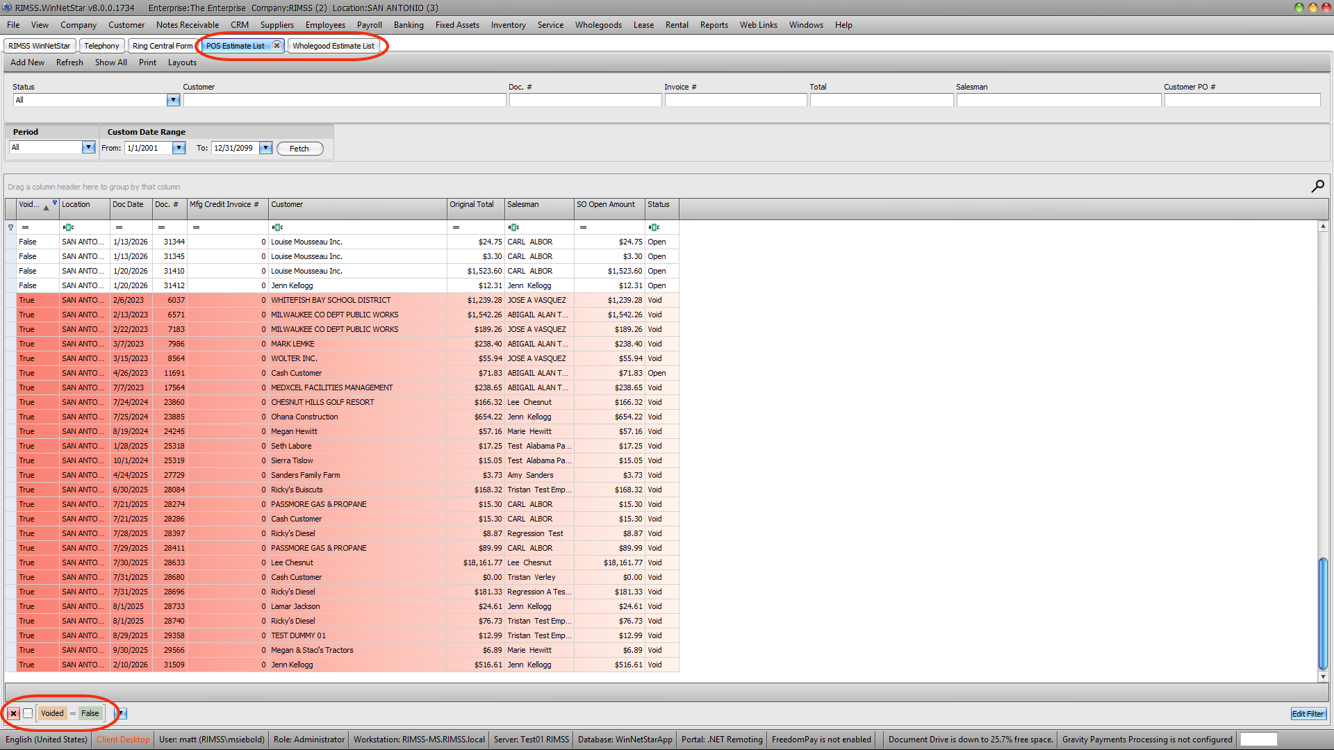 To see a list of voided estimates, simply uncheck the "voided = false" box in the bottom left corner of the Estimate List and all voided estimates will appear in the grid.