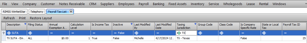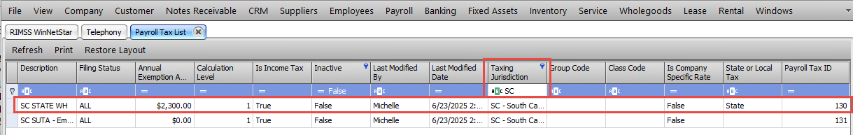 Enter your State Code in the Taxing Jurisdiction Column to filter to your state taxes. Double click on the State WH option that you are ready to udpate.