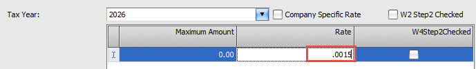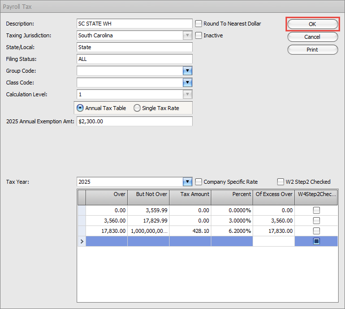 Click OK at the top right of the popup once the new amounts are entered and verified. This tax will take effect in the next payroll created with a check date in the calendar year noted.