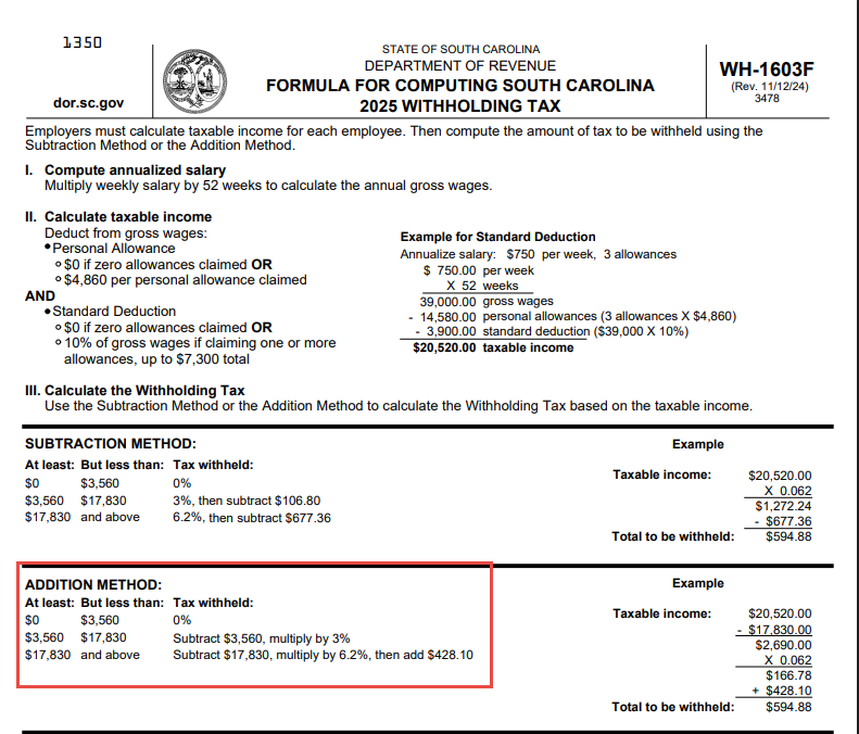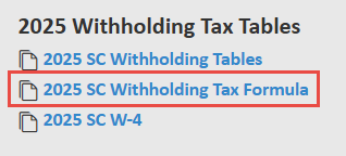 In my example, I will be using the South Carolina State Withholding documentation. Below are the Withholding Table options they provided. I chose the 2025 SC Withholding Tax formula. This state separates the standard tables and the formula tables, but some states will include both in a single document.