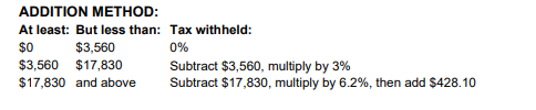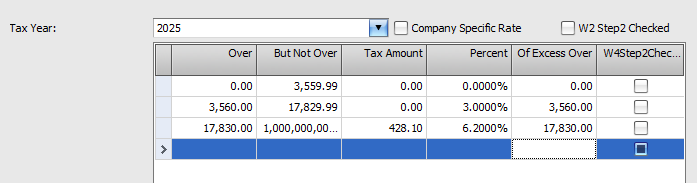 NOTES: Ensure that the tables do not overlap dollar amounts. I adjusted the But Not Over down by 0.01 to achieve this when using the But Less Than amounts. For the final level, I chose an amount that would never be exceeded by an employee in payroll.