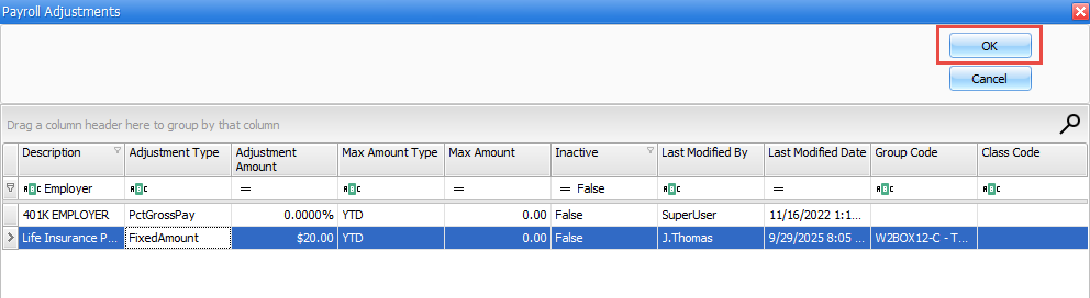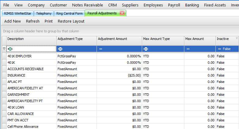 Below is an example of a Payroll Adjustments list that includes both employer and employee adjustments.