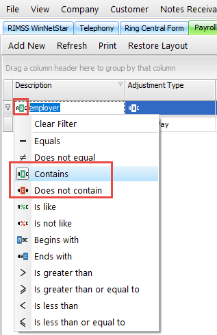 To filter to only employer costs, I can type the word employer in the Description column while using the Contains filter. Alternatively, I can change the filter to Does Not Contain to see only payroll adjustments. Click on the icon in the filter field to choose the correct filter.
