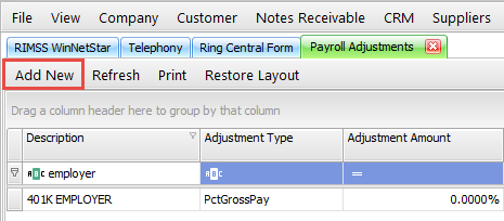 To add a new Employer Cost Adjustment, click on Add New at the top left of the Payroll Adjustments list.