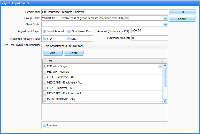 Pre-Tax Payroll Adjustments: If the Employer Cost will be considered taxable income to the employee, you can add all of the taxes that are applicable to the income. You will need to verify this information with your tax professional.