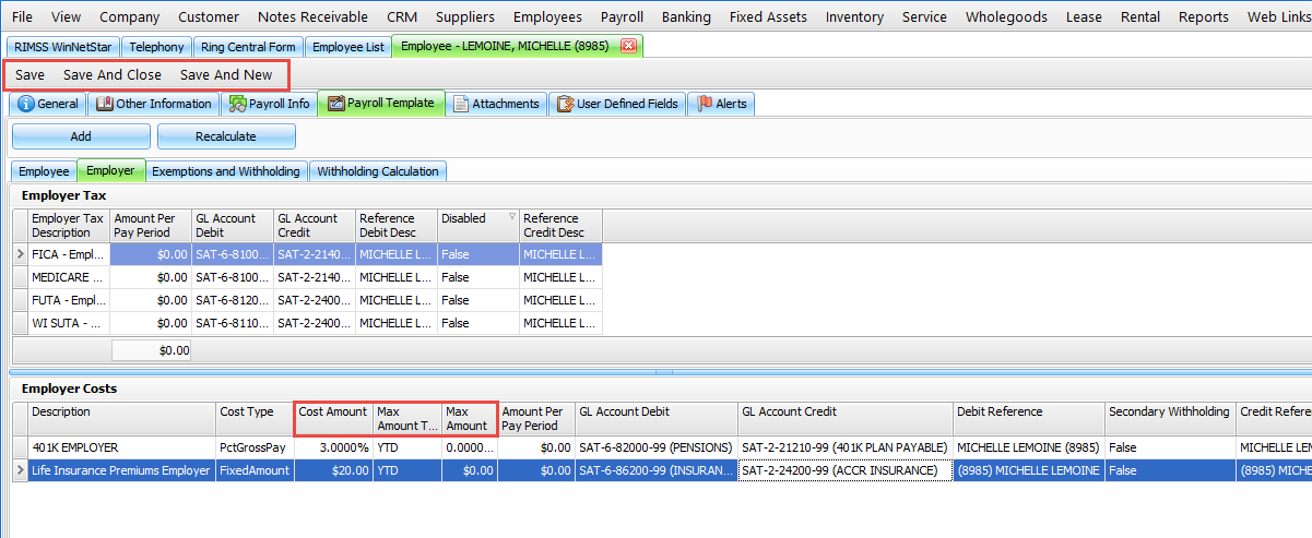 Next you can add the Cost Amount or Percentage and any Max Amount that applies. Once you have verified the amounts are correct, click on Save, Save and Close, or Save and New to apply these changes to the employee's payroll template.