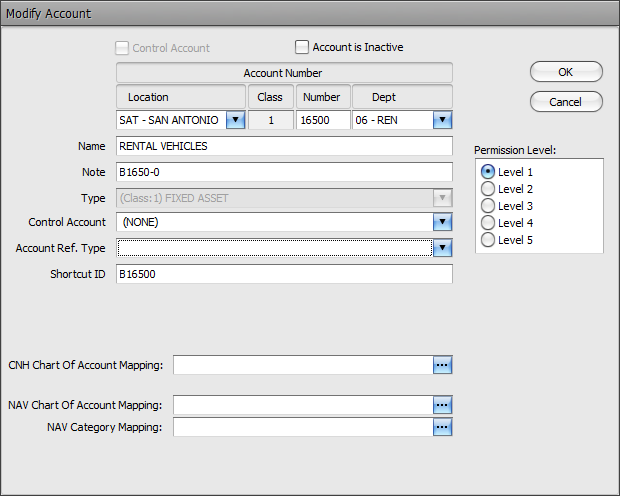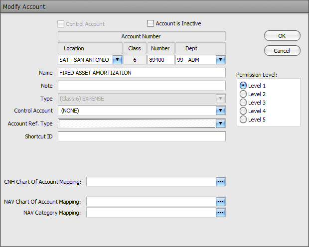 - You will need to set up the Asset Account(s) and the Depreciation Account(s) with the Account Type of Fixed Asset. These accounts will not be referenced to Fixed Asset. You must have at least one asset account and one depreciation account created. Examples are shown below.