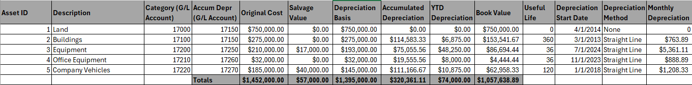 - When using this method, the fixed asset schedule and depreciation calculations will be maintained separately from RIMSS. This may be done by your tax professional or in a separate program or spreadsheet. The schedule will provide the information on descriptions, Asset Values, Depreciation, Net Values, and more. Below is an example of the type of information that your tax professional might provide.