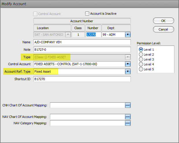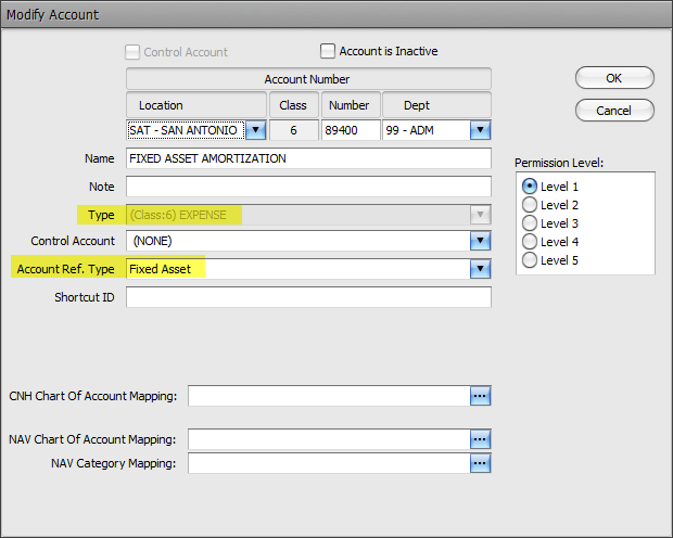 Using the Fixed Asset Module for Detailed Tracking and RIMSS calculation of Accumulated Depreciation requires that all Fixed Asset accounts are set up with references to Fixed Asset. Here we will show examples of setting up the referenced accounts, and the standard accounts that are required for automatic Depreciation calculation and reporting.