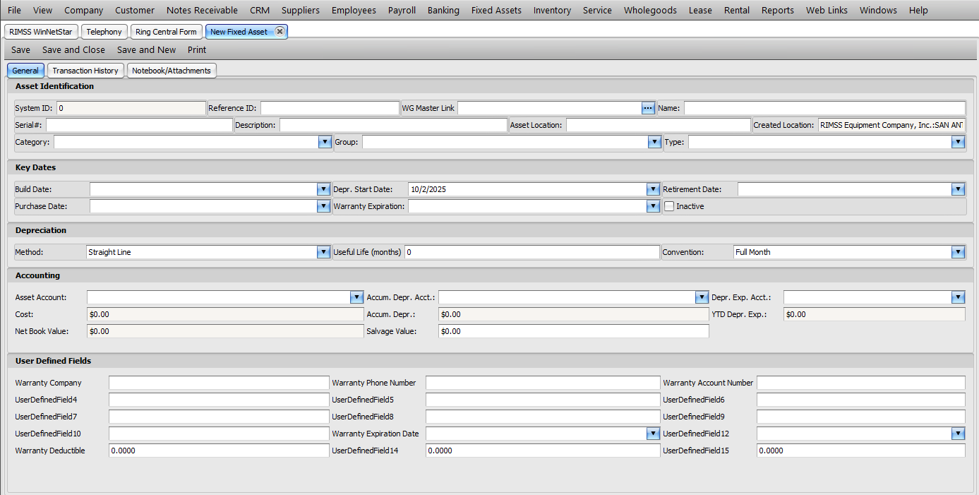 RIMSS will open a blank New Fixed Asset document for you to complete and save.