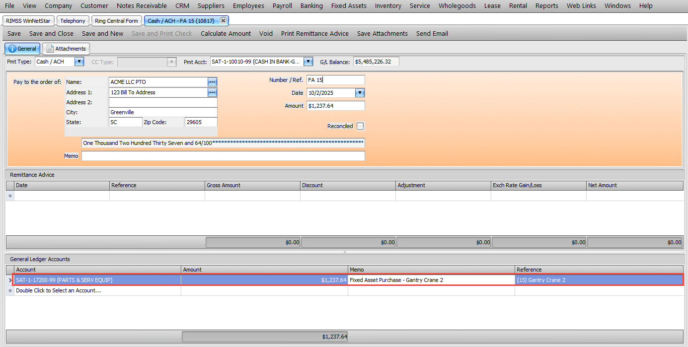 Once the Fixed Asset Master is created, you will need to create the accounting entry to book the asset value to the correct G/L account. RIMSS will populate the Cost on the Fixed Asset after you save the entry. You may use any document in RIMSS that allows you to post to the Fixed Asset account. Below is an example of a payment document posting cost for this Fixed Asset.