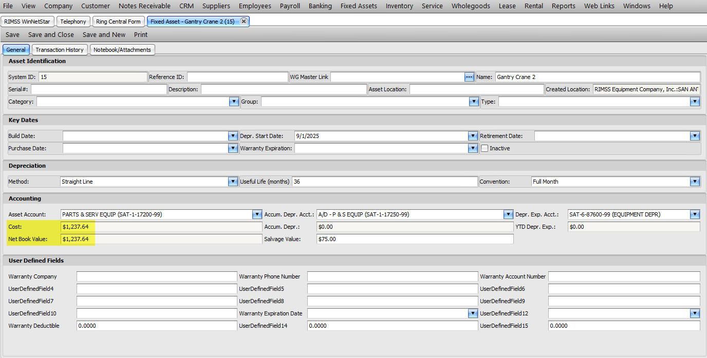 Net Book Value: Auto-populated by RIMSS using the formula: Total Cost - Total Accumulated Depreciation
