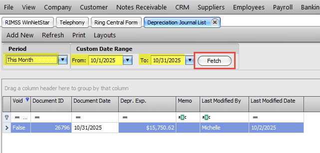 Set the date range to include the Depreciation Journal you want to review and click Fetch. Double click on the Depreciation Journal in the list to open the report.