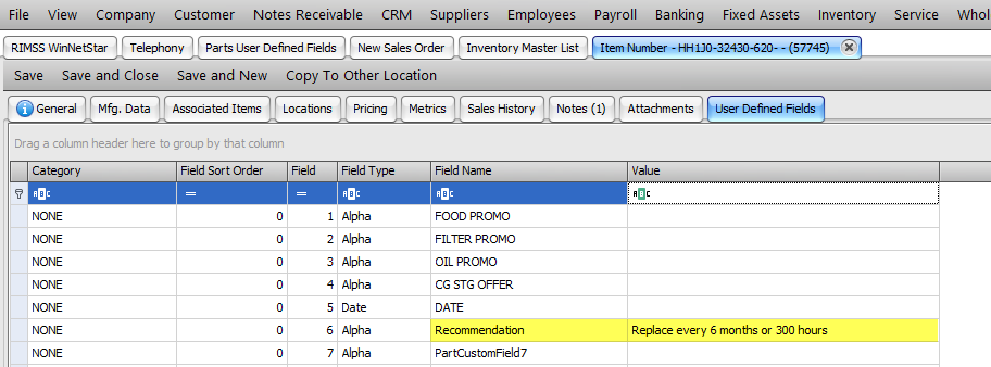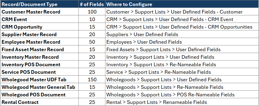 Inventory and Wholegood Master User Defined Fields Special Feature