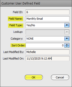 Once all fields have been completed, click OK to save the new User Defined or Re-Nameable field.