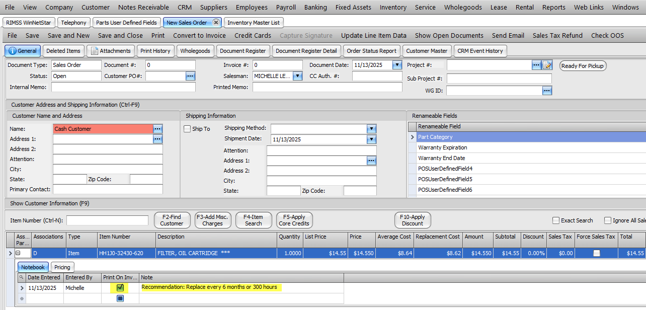 The Note will be added to the Estimate, Sales Order, or Invoice at the time that you add the Part or the Wholegood to the document. Once the note has been populated, you can delete or edit the note in the same manner you would with a manually added note. The note will also carry over to Sales Orders or Invoices when you convert from Estimates or Sales Orders.