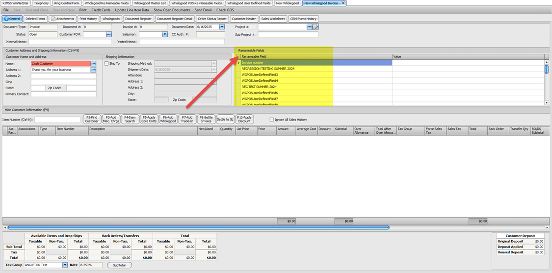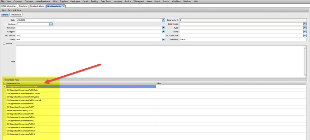 Open a Wholegood Estimate or Wholegood Sales Order and look for the Re-Nameable Fields area on the General tab