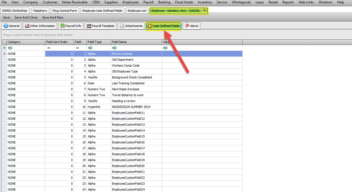 Open an Employee Master record and navigate to the User Defined Fields tab