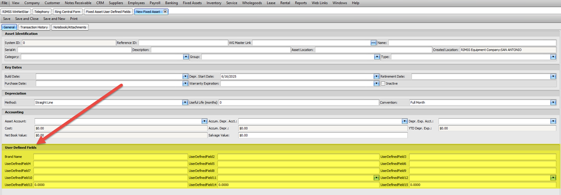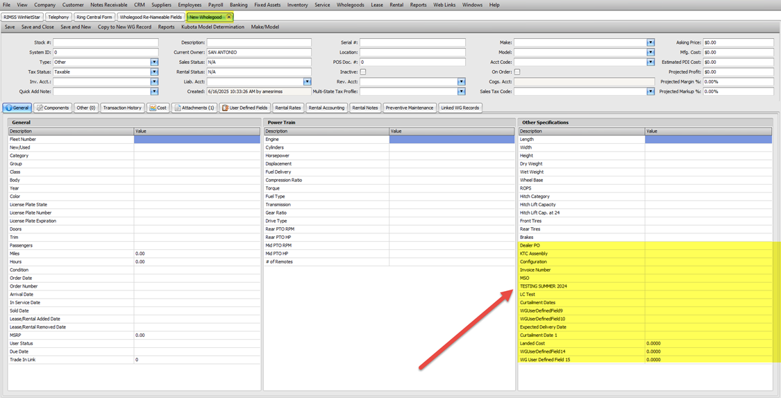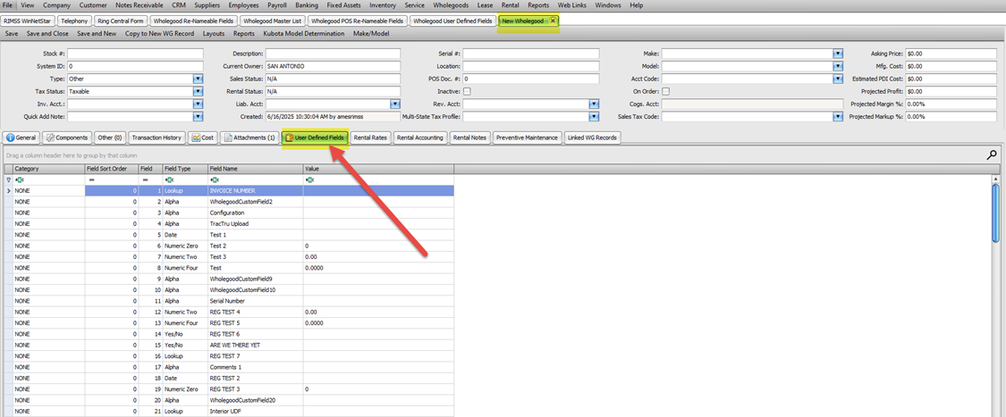 Open a Wholegood Master record and navigate to the User Defined Fields tab