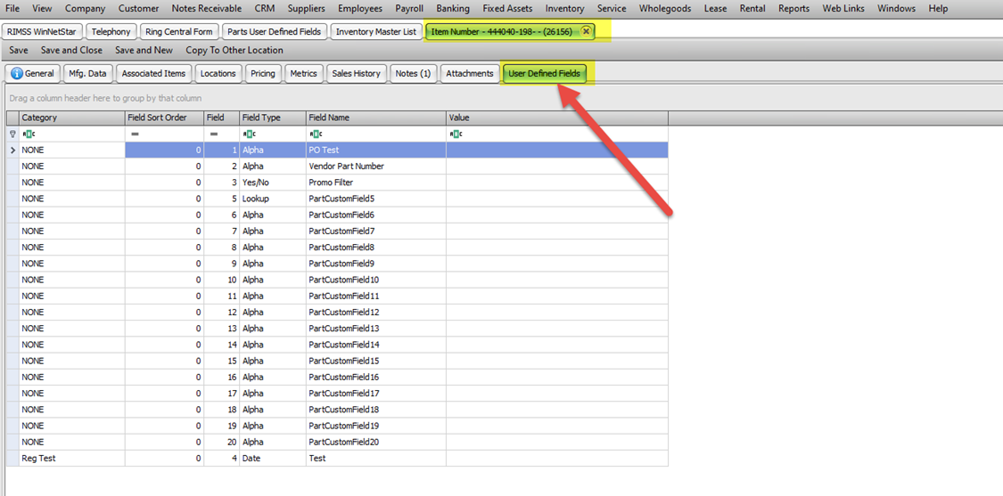 Open an Inventory master record and navigate to the User Defined Fields tab