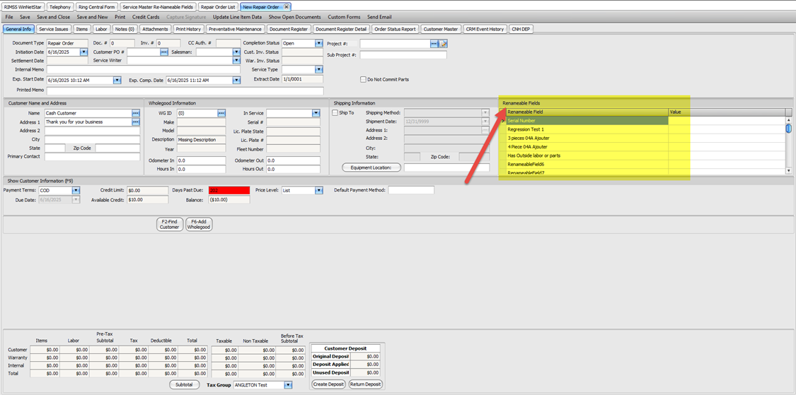 Open a Service Estimate or Repair Order and look for the Re-Nameable Fields section on the General tab
