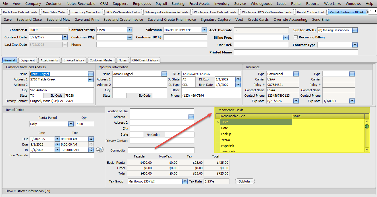 Open a Rental Contract and look for the Re-Nameable Fields section on the General tab