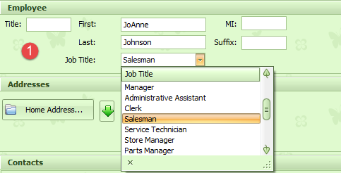 - Enter the name of the Employee and add their Job Title in the dropdown. You can type directly into each available Name field. The Employee First and Last Name are the only required fields to complete to be able to save the Employee Record. You can add this information now and return to the Employee Master Record to complete the remainder of the fields at a later time. The Job Title field can be populated from the dropdown. The list of Job Titles can be edited at: Company > Enterprise Support Lists > Job Titles