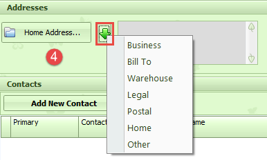 - You can add the Employee address in the Addresses section. The green arrow dropdown allows you to choose different address records if you will need to retain more than one address for the employee. Clicking on the Address button to the left of the green arrow will give you a pop-up for input of the selected address field.