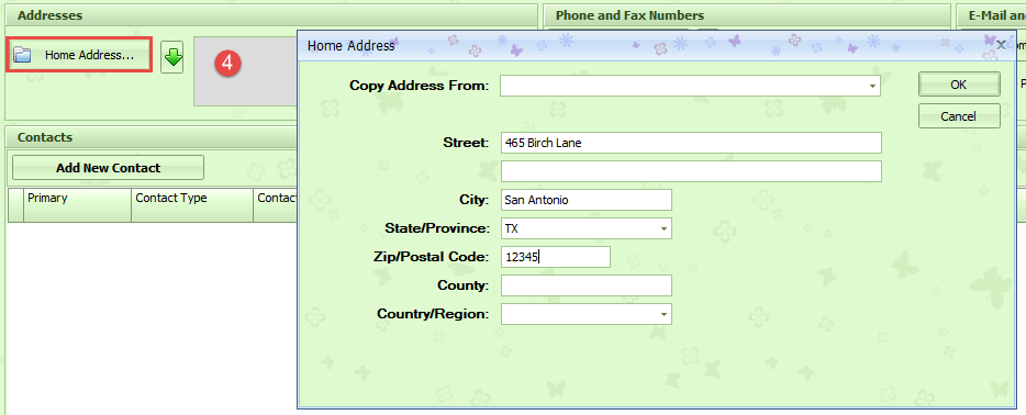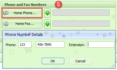 - Phone and Fax Numbers can be entered in the same method as the addresses. The green arrow button will allow you to choose different fields for entry of multiple phone or fax numbers and the Phone and Fax buttons will allow you to enter the numbers for the selected field.