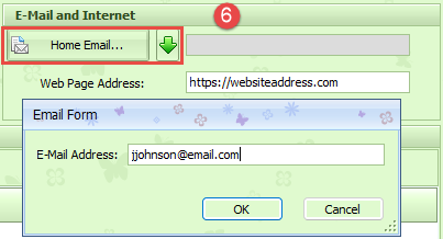 - Email addresses and a website address can be added in the Emails and Internet section. There are 3 email addresses that can be added using the Green Arrow and the Email button. A web address may be typed manually into the field.