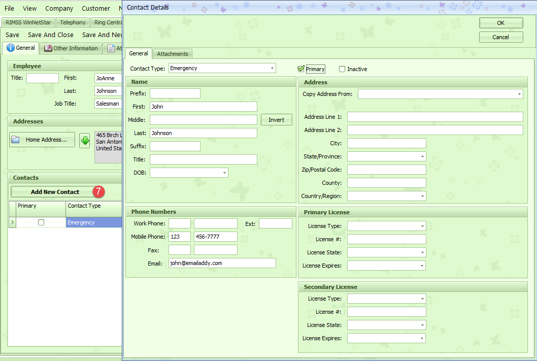 - You can add multiple Contact Records for an employee in the Contacts area by clicking on the Add New Contact button. This will pop-up a box where you can enter the details of a contact. The Contact Type dropdown allows you to choose labels for the contact such as Emergency Contact, Alert Recipient, or any other label you wish to create. You will need to add a First Name, Last Name, and either a Phone Number or Email Address to save the record. You may select the box to set the contact as the Primary Contact for the employee and you may also inactivate the contact if no longer needed.