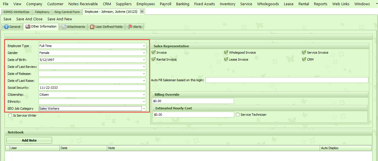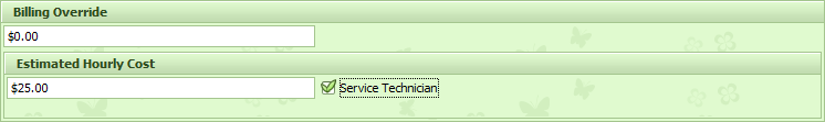 - In the bottom half of the Sales Representative area are fields and a checkbox that can be configured as needed. All of these fields are configuration options for Service Technicians. You will need to check the box next to Service Technician for the employee to show up as a Service Technician on Repair Orders and Time Slips. The Billing Override field allows you to set a custom labor rate that will be charged when the Employee has actual hours booked on a Repair Order. This billing rate will override any standard rate that would be populated in the normal course of business. The Estimated Hourly Cost field is required to have a positive amount entered when you have the box for Service Technician checked. This field will tell the system the hourly Labor COGS to be booked for actual hours the Technician works on Repair Orders. You can set this hourly rate to any positive dollar amount that you deem appropriate. You will not be able to save the record with the Estimated Hourly Cost amount at 0.00 and the Service Technician box checked.