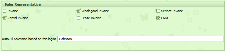- The Sales Representative area has 2 separate configuration areas. In the top half of the area are a list of RIMSS documents with checkboxes. By checking the boxes in this area, the employee will populate in the Salesman dropdown list for the specific document type. Unchecking a box will remove the employee from the Salesman dropdown list for the specific document type. Next, type in the username that will be set up for the employee in the field Auto Fill Salesman based on this login. This feature will autofill this employee as the salesman on documents they create using their login.
