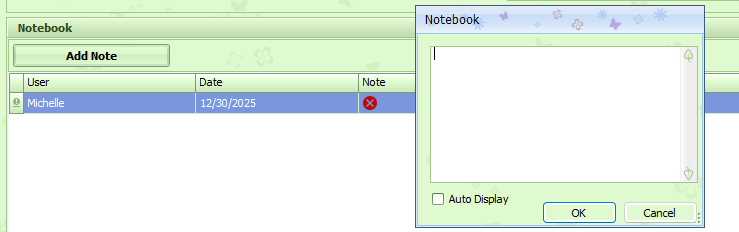 - The Notebook area allows you to add freeform notes to the Employee Master Record. Click on the button to Add Note to prompt the pop-up for adding any notes you want to maintain. You may add as many notes as you wish. To delete a previously added note, right click on the note and click on the Delete This Line option.