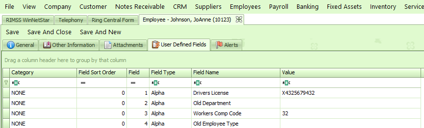 - The User Defined Fields tab allows you to capture custom information for which there is no existing field in RIMSS. You may customize these fields by navigating to Employees > User Defined Fields.