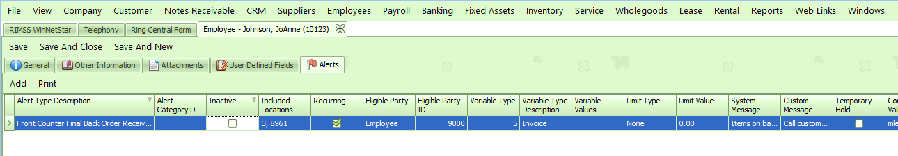 - The Alerts Tab allows you to configure Alerts to notify the Employee of events in RIMSS. There are separate help documents to walk you through this process that can be found here: https://help.rimss.com/category/7-alerts