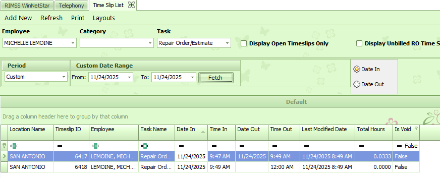 Set your date range, select the Date In or Date Out option for filtering the dates, and select an Employee or Task if applicable. Once all pre-fetch filters are selected, click Fetch. Double click on the correct Time Slip in the list to open and edit the document.