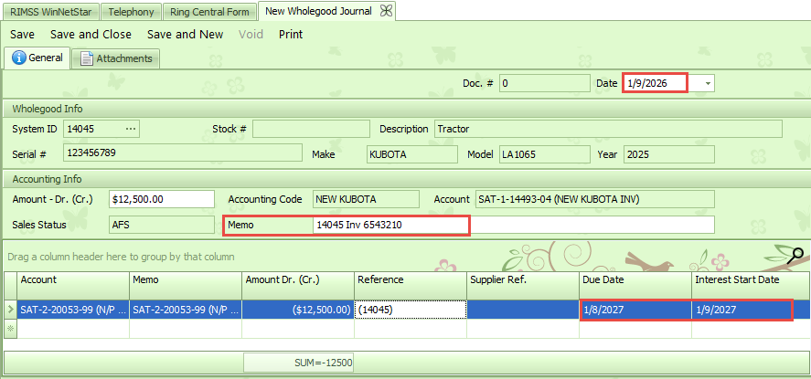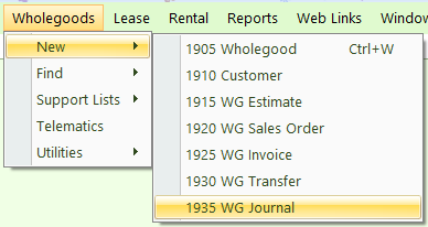 To create a Wholegood Journal, navigate to Wholegoods > New > Wholegood Journal