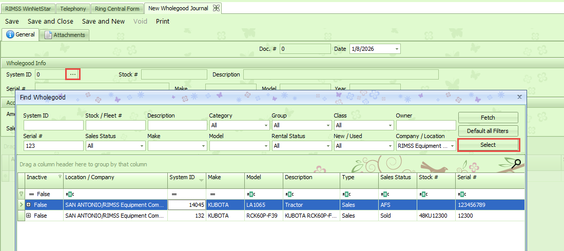 Add the wholegood that you are posting by clicking on the ellipse (3 dots) to the right of the System ID field. This will pop-up a Wholegood List where you can search for the unit. Once you find the unit in the list, select it and click on the Select button. The wholegood will populate on the document.