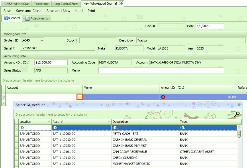 There are also features that have been added to a regular Journal Entry that simplify adding any g/l account assigned to a wholegood to the journal entry. You can review these options in the document Adding Wholegood Line Items to Journal Entries.