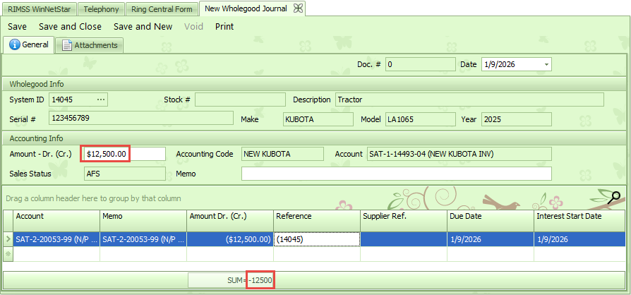When adding the wholegood to the document, the system will populate information about the wholegood to include Stock #, Serial #, Description, Make, Model, and Year. Additionally, the system will populate the Wholegoods Inventory Account assigned to the unit if the unit status is AFS. If the unit status is Sold, the system will populate the COGS assigned to the unit. You can add cost to the unit by entering the amount in the Amount - Dr. (Cr.) field. A positive number will add cost and a negative number will remove cost.