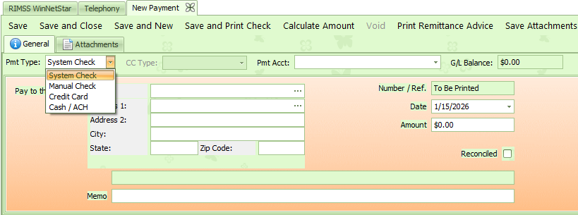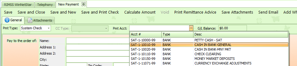 Creating a System Check, Manual Check, or Cash / ACH payment will default the account choice to the list of Bank Accounts in the Pmt Acct drop-down. For these types, you will need to select the Bank Account where the transaction will be posted.