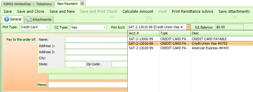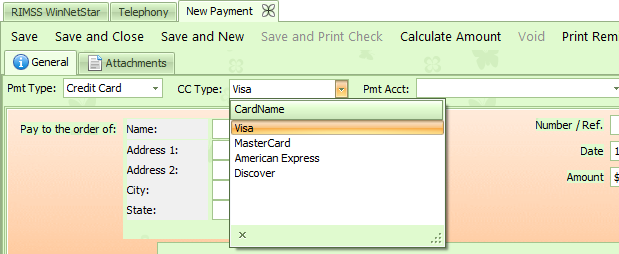 Creating a Credit Card payment will change the account options to the accounts of type Credit Card Payable set up in RIMSS. In addition, you will be able to select the Credit Card type. Select the correct Credit Card type and account from the drop-downs.