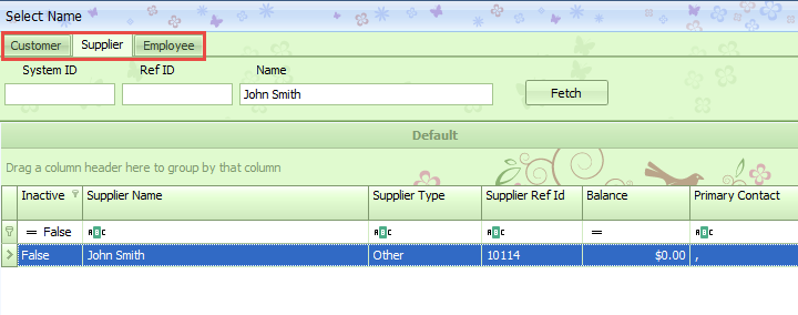 Next click on the ellipse (3 dots) in the Name field to add the Payee to the document. The pop-up will default to the Supplier tab of the Payee selection. You can select the Customer or Employee tab to search and add a Payee of those types. Once you are on the correct tab, enter the search criteria and click Fetch. Double-click on the name of the Payee to add to the document.