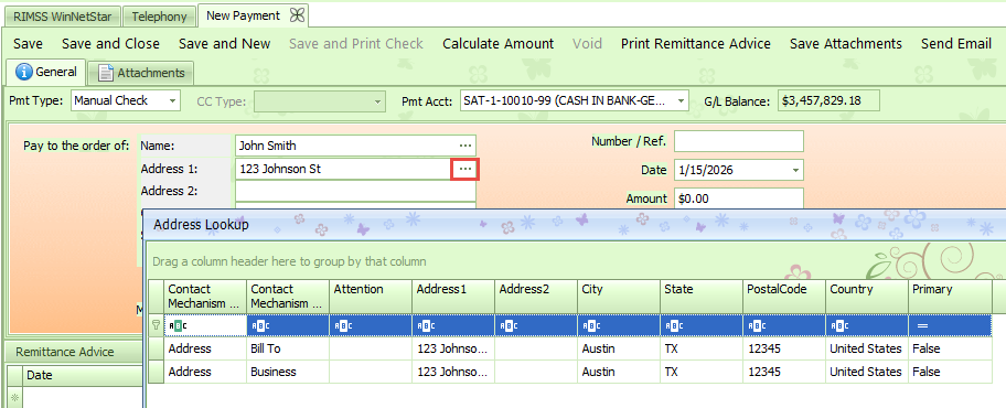 You can select a different address set up on the Payee record by clicking on the ellipse (3 dots) in the Address 1 field.