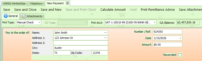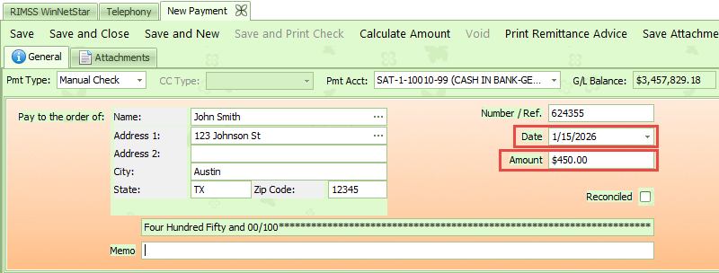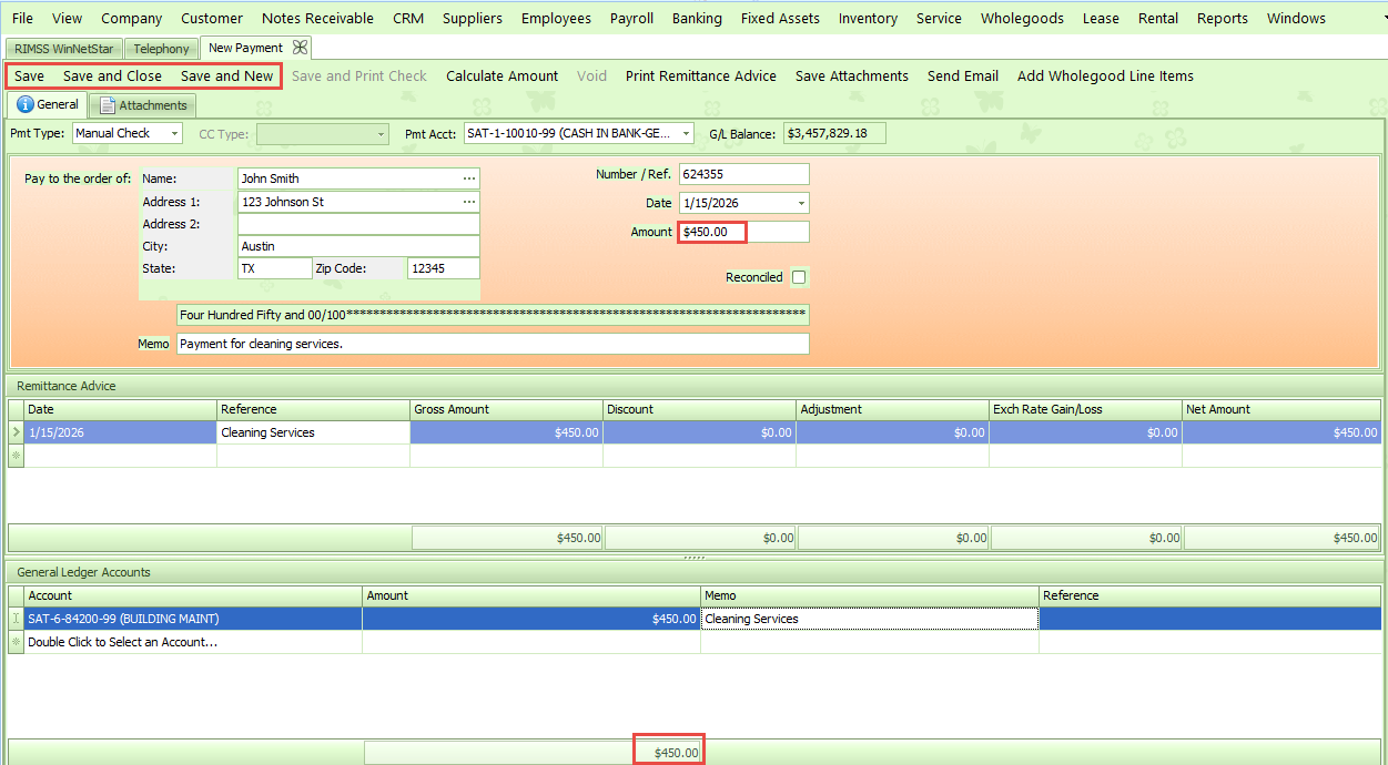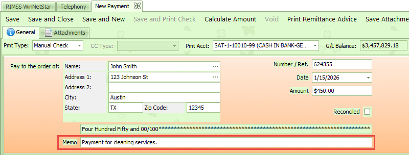 You can add line item memos to each G/L line added to the payment. These will be visible in reports and reconciliations. Verify that the Amount in the header matches the total of all line items in the bottom section. Click on Save, Save and Close, or Save and New when all information is complete and in balance.