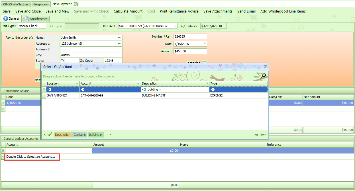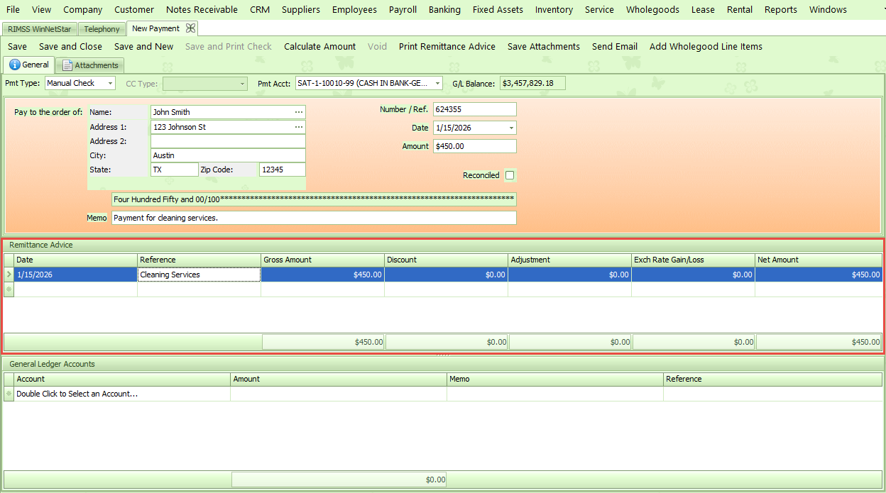 The General Ledger Accounts section allows you to add the offsetting accounts and amounts for the payment. You may add as many line items as you wish, but the total of the Amount column must equal the total in the Amount field. Note that the amounts entered in the top and bottom sections are both input as positive amounts. The top amount will post as a credit and the bottom section amount will post as a debit. You may add positive and negative amounts in the bottom section as long as the total balances with the Payment Amount.
